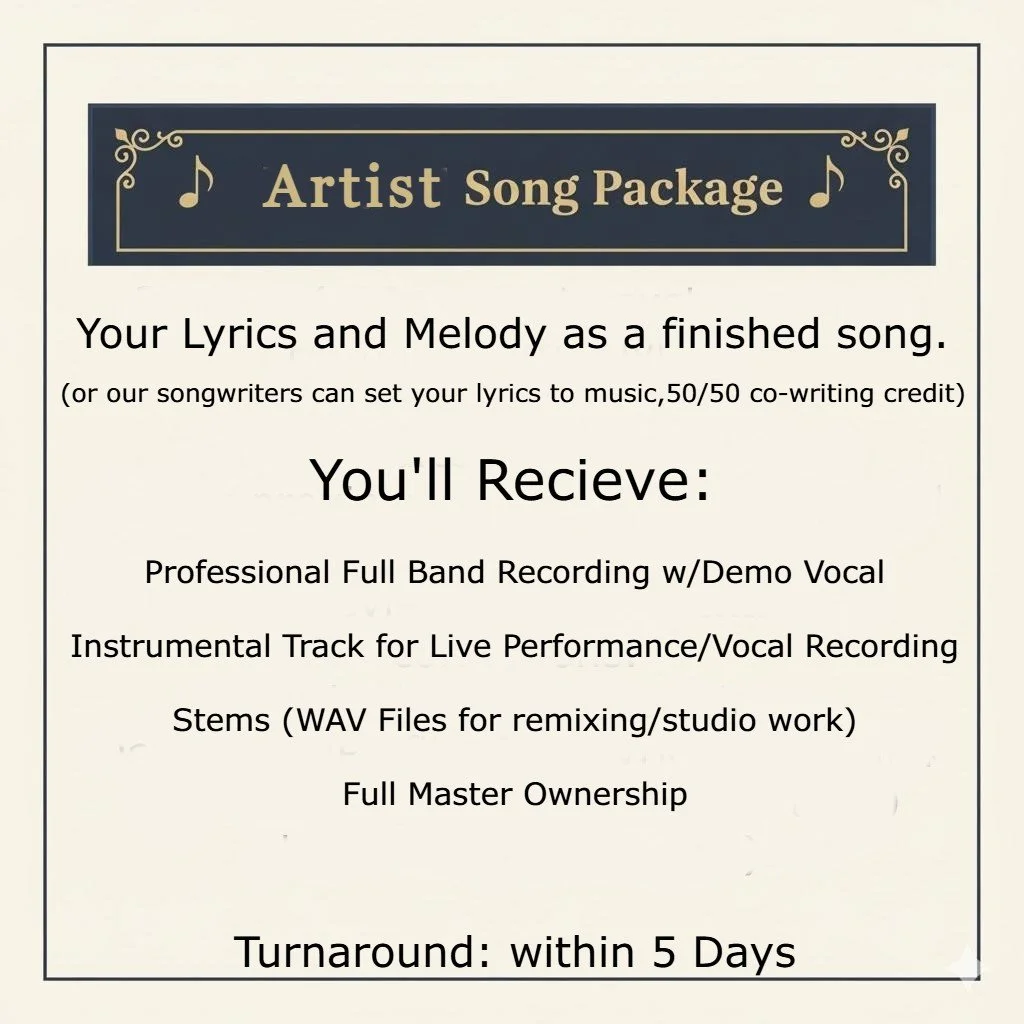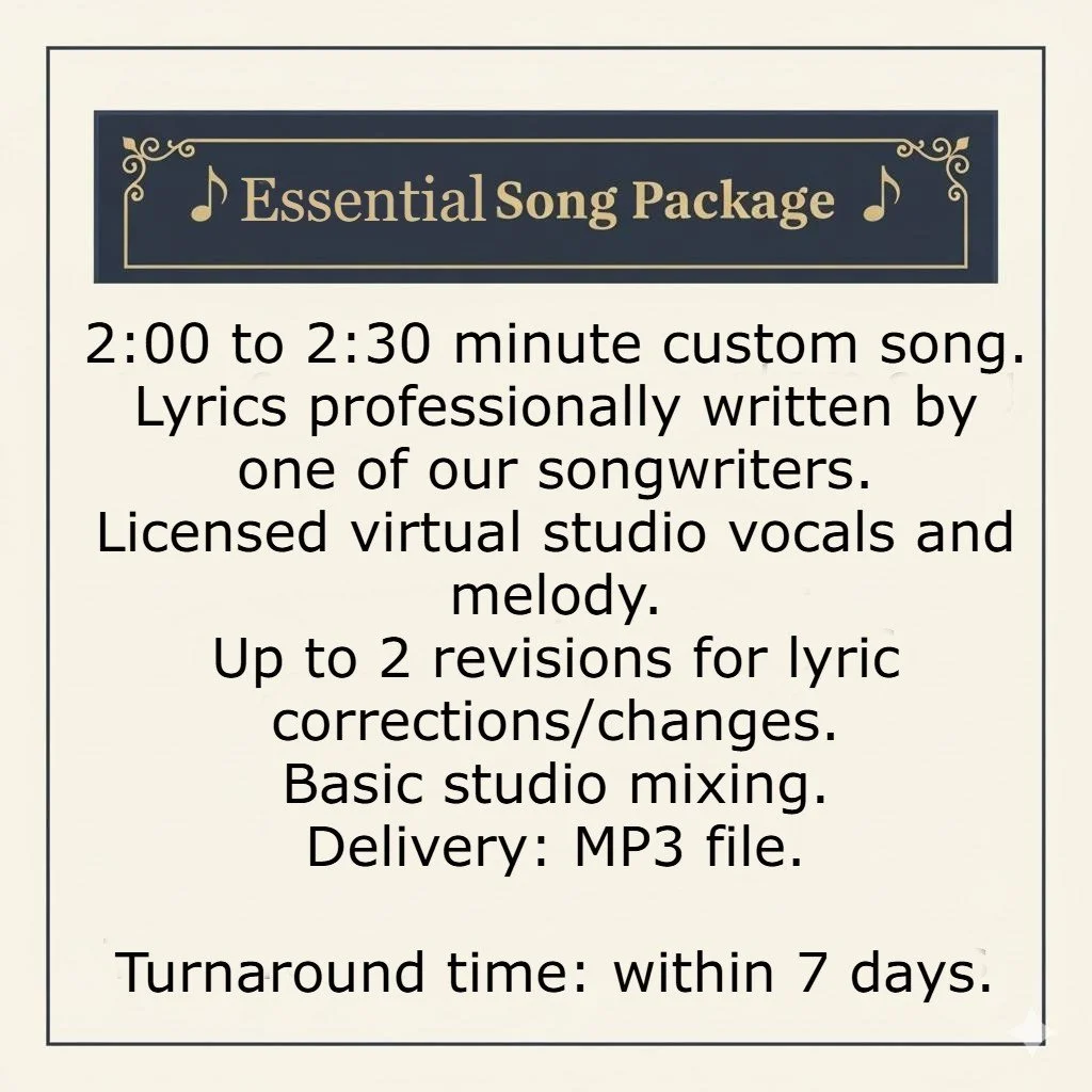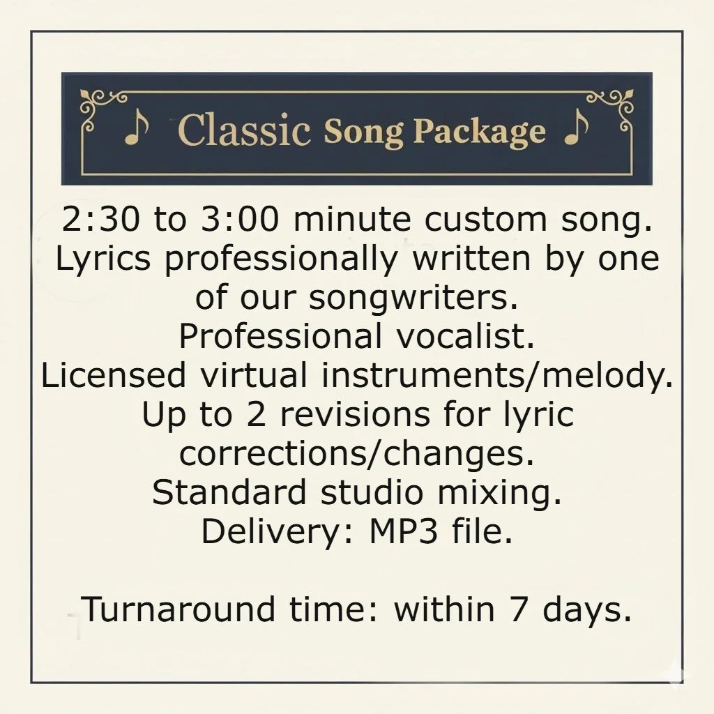 Select your song package, fill out the form and tell us your story, details, and genre (classic or modern country, Pop, Rock, R&B, Hip Hop/Rap, Power Ballad, Standard/Jazz, even decade request like 70’s, 80's or 90's, etc..),